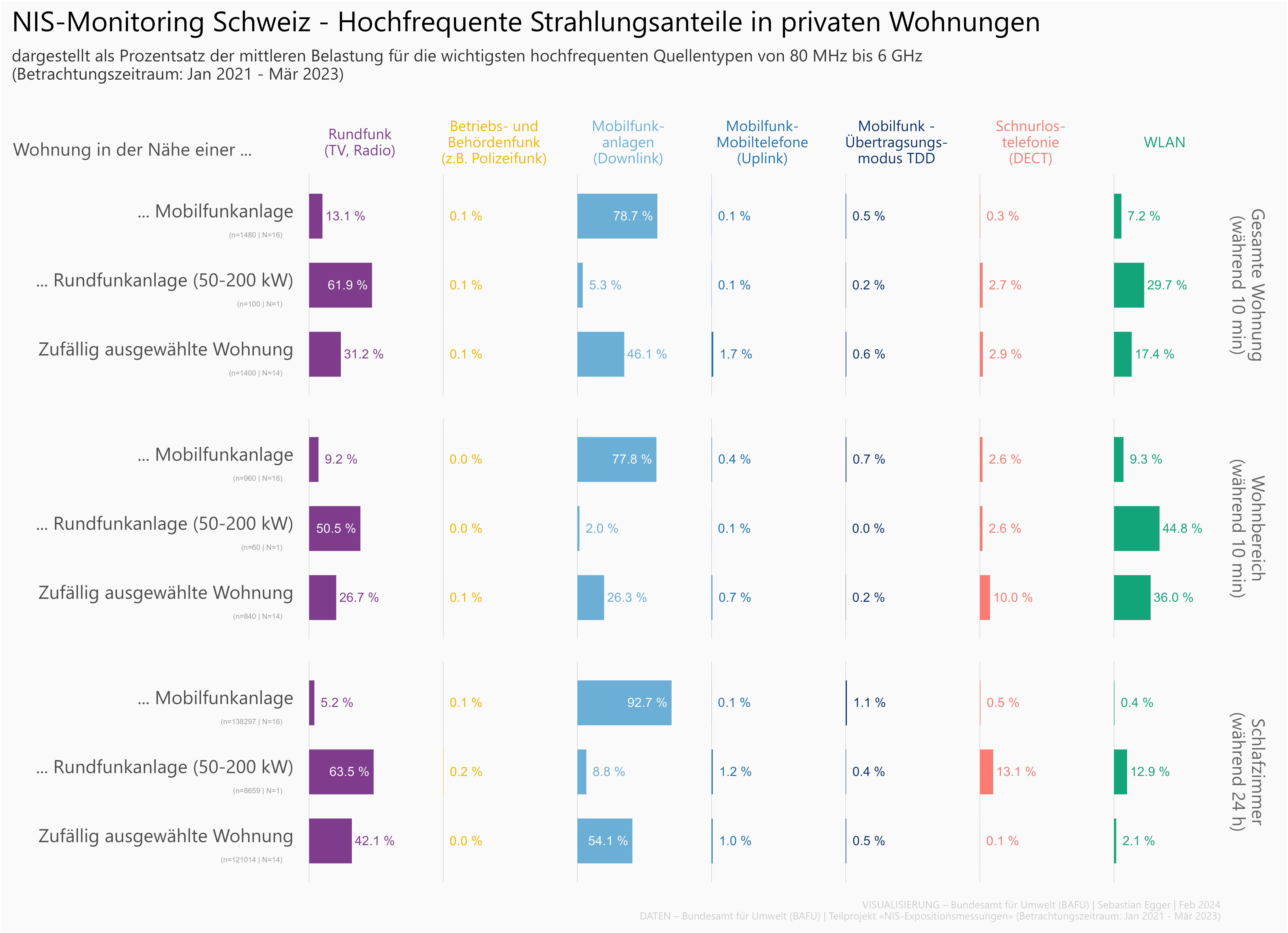Im Vergleich mit einer Studie von 2014, die im Auftrag des BAFU mit ähnlichem Messkonzept durchgeführt wurde, zeigt sich, dass die Belastung 2021 auf einem ähnlichen Niveau wie 2014 liegt – trotz einer Verzwanzigfachung der übertragenen Datenmenge per Mobilfunk im gleichen Zeitraum [vgl. Indikator Elektrosmog (admin.ch)]. Die Fortführung und Wiederholung der Messungen in der jetzigen Messreihe und die stationären Dauermessungen werden zukünftig weitere Analysen zur zeitlichen Entwicklung der NIS-Belastung ermöglichen.Welche Umgebungsquellen tragen am stärksten zur