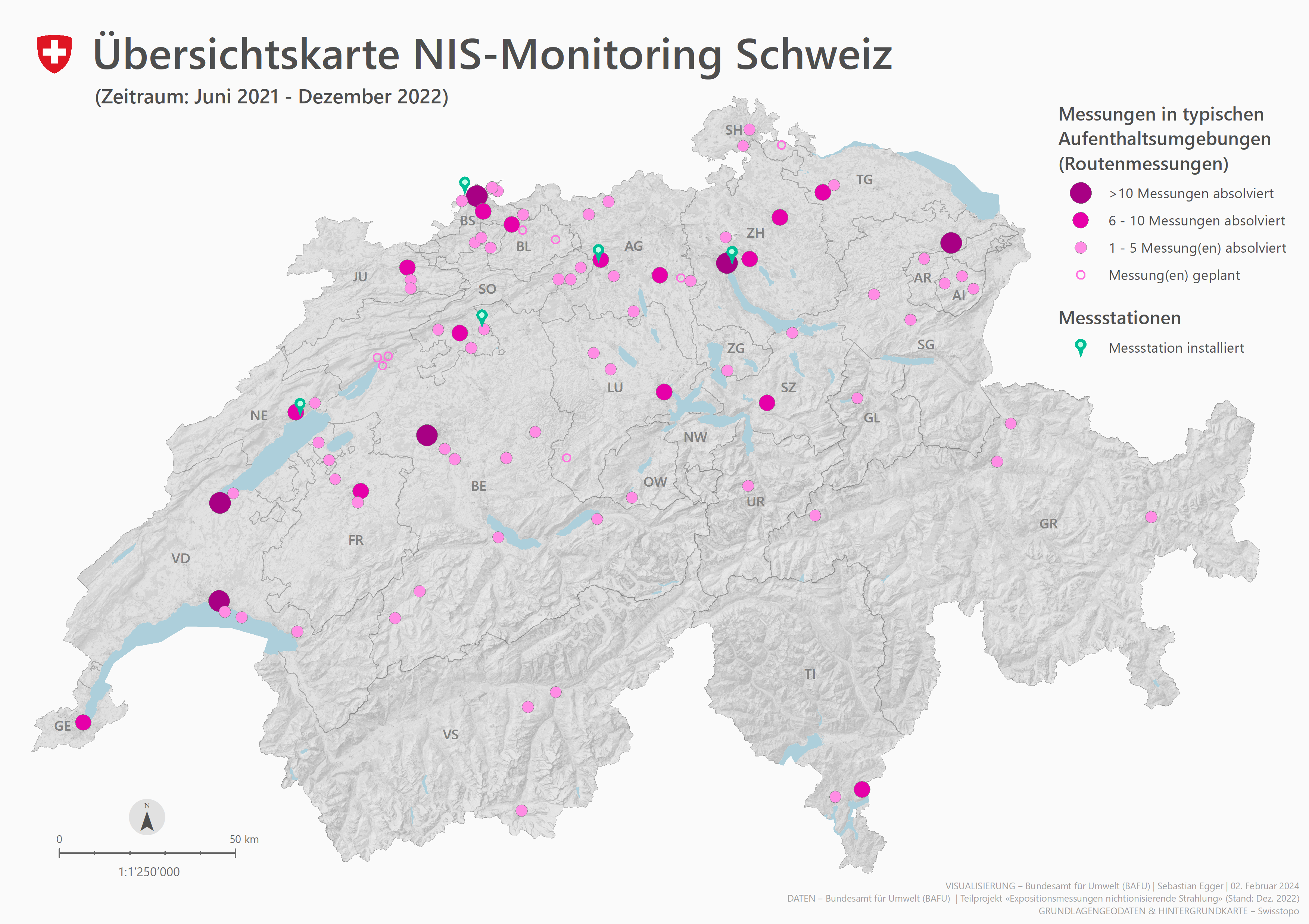 Mit den NIS-Expositionsmessungen soll die tatsächliche Belastung der Bevölkerung durch die wichtigsten Quellen von nichtionisierender Strahlung (z.B. Hochspannungsleitungen, Rundfunksender, Mobilfunkanwendungen, WLAN) erfasst werden. Zu diesem Zweck lässt das BAFU seit 2021 schweizweit Messungen in typischen öffentlichen Aussen- und Innenbereichen und in Privatwohnungen durchführen. 2022 konnten die ersten Ergebnisse publiziert werden.