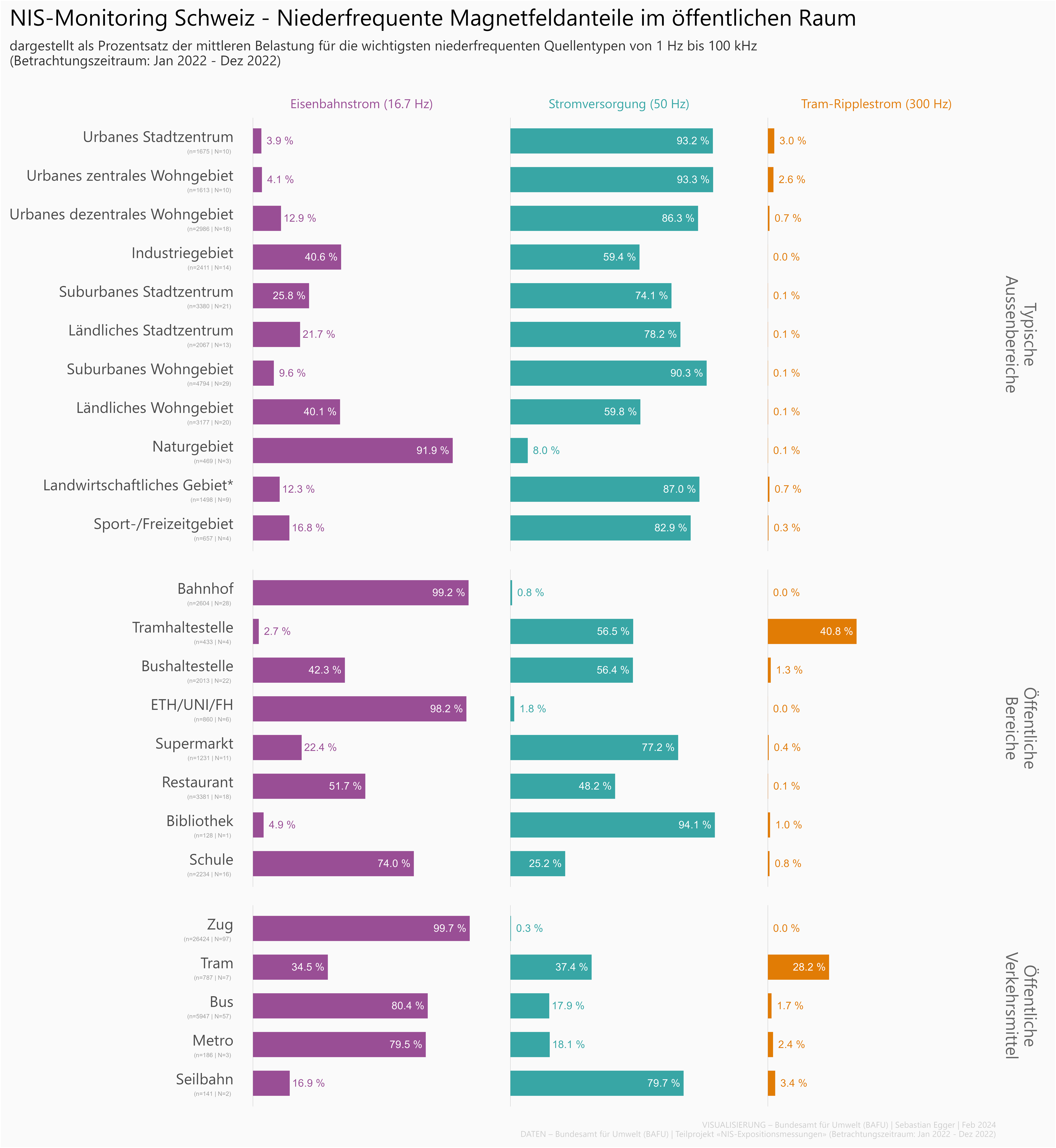 Abbildung 10: Niederfrequente Magnetfelder im öffentlichen Raum In den meisten gemessenen Umgebungen wird der Hauptteil der Belastung durch niederfrequente Magnetfelder von Anlagen zur Stromversorgung (50 Hz) bestimmt. Seltener ist der Eisenbahnstrom (16.7 Hz) die dominante niederfrequente Quelle, wie z.B. an Bahnhöfen oder in Zügen. Dass der Eisenbahnstrom auch in Naturgebieten, Hochschulen und Schulen den Hauptanteil der niederfrequenten Belastung ausmacht, ist überraschend und könnte damit zusammenhängen, dass sich einige dieser Messorte nahe einer Bahnstrecke befanden. Allerdings sind die Belastungen durch niederfrequente Felder an diesen Orten insgesamt so gering, dass sich kaum generelle Aussagen zu den ohnehin sehr kleinen mittleren Quellenbeiträgen ableiten lassen. Die Anteile des Tram-Rippelstroms (300 Hz) sind erwartungsgemäss nur an Tramhaltestellen und in Trams ausgeprägt.