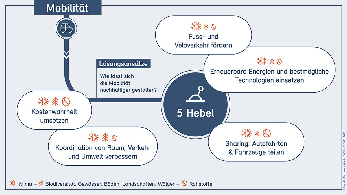 Die Mobilität gehört nach der Ernährung und dem Wohnen zu den Konsum- und Produktionsbereichen mit den grössten Auswirkungen auf die Umwelt. Durch verschiedene Hebel und Handlungsansätze ist es möglich, die Mobilität ressourcenschonender und nachhaltiger zu gestalten.