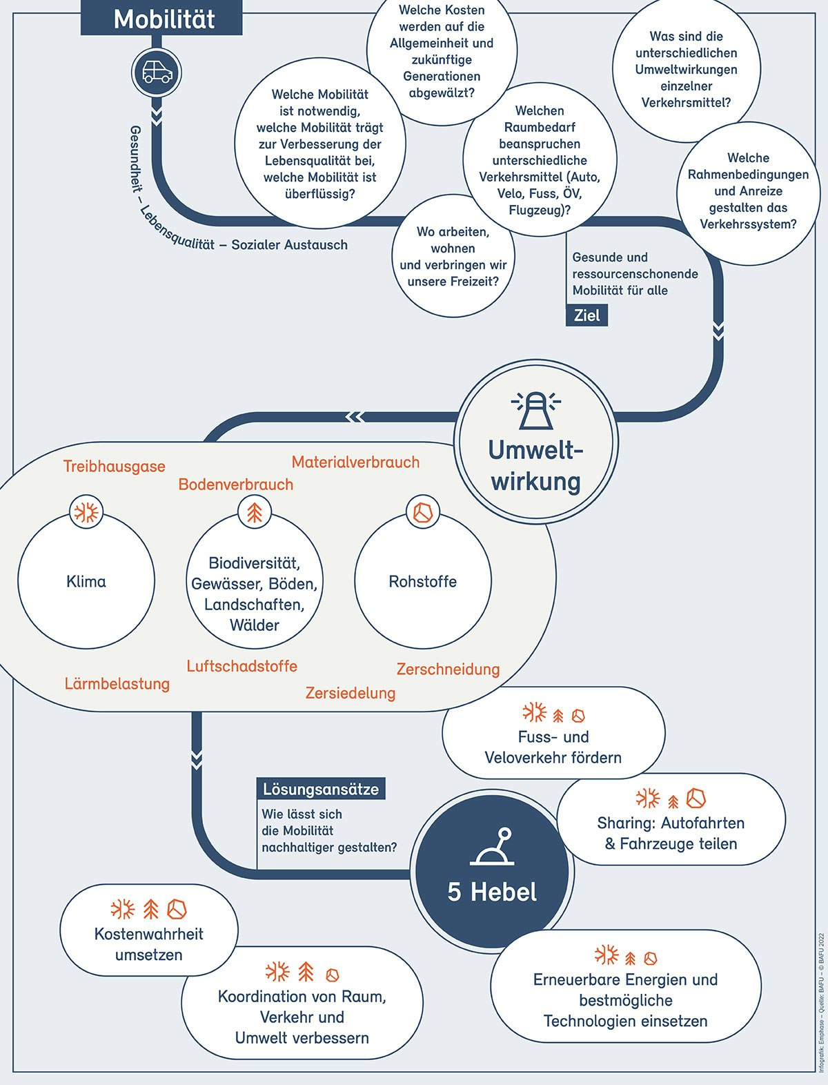 Mobilität verbindet Menschen und Wirtschaft in allen Regionen der Schweiz. Gleichzeitig hat der stetig wachsende Verkehr auch negative Auswirkungen: Er belastet Mensch und Umwelt durch Treibhausgasemissionen, Luftschadstoffe, Lärm, Zerschneidung der Lebensräume sowie durch den Verbrauch von Boden und Ressourcen. Bei der Weiterentwicklung der Verkehrsinfrastrukturen und der Angebote sind die Bedürfnisse der Gesellschaft, der Wirtschaft und der Umwelt ausgewogen zu berücksichtigen. Grosse Chancen zur Verbesserung der Umweltverträglichkeit des Verkehrs bieten die Förderung des Fuss- und Veloverkehrs, geteilte und multimodale Angebote, eine verbesserte Abstimmung von Raum und Verkehr sowie umweltschonende und auf erneuerbaren Energien basierende Mobilitätstechnologien.