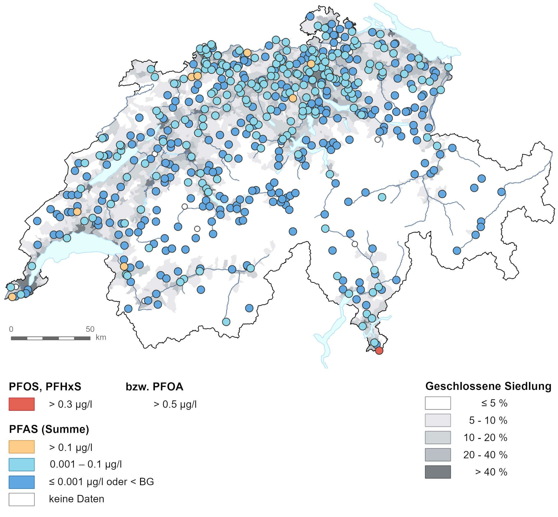 Im Rahmen der Nationalen Grundwasserbeobachtung NAQUA fand 2021 eine Pilotstudie zu PFAS statt, bei der alle knapp 550 NAQUA-Messstellen beprobt und auf insgesamt 26 verschiedene PFAS untersucht wurden. Es handelt sich dabei um PFAS, die mit den gängigen, standardisierten analytischen Methoden sicher bestimmt werden können. Sie schliesst die 20 PFAS ein, für die in der EU ein Grenzwert im Trinkwasser festgelegt wurde.