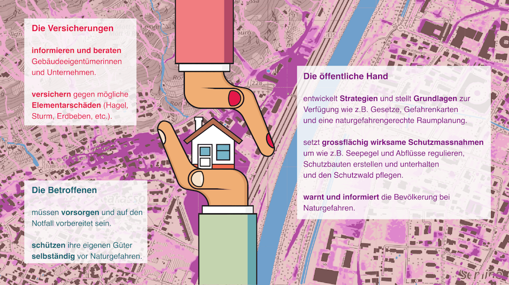 Alle durch Naturgefahren potenziell betroffenen Personen, beispielsweise Hauseigentümer/innen oder Infrastrukturbetreibende, nehmen ihre Eigenverantwortung wahr, indem sie ihr Gebäudeeigentum naturgefahrengerecht erstellen und den Schutz mithilfe von Objektschutzmassnahmen erhöhen. Persönliche und betriebliche Vorsorge, sowie das korrekte Verhalten im Ereignisfall mindern den Schaden ebenfalls. Zusätzlich tragen weitere Akteur/innen zum Schutz vor Naturgefahren bei. So sorgen beispielsweise Planerinnen und Ingenieure im Rahmen ihrer Sorgfaltspflicht dafür, Risiken bekannt zu machen und risikoreduzierende Massnahmen vorzuschlagen und umzusetzen.