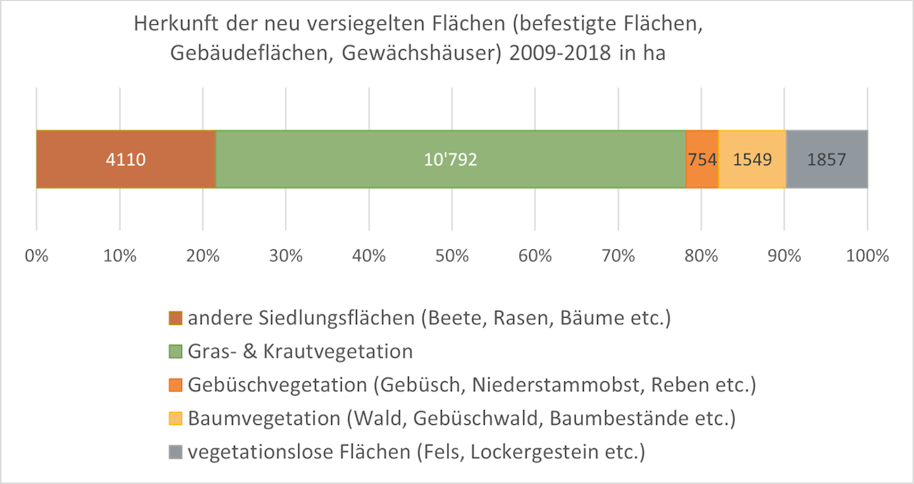 Die zweite Entwicklung hinter der zunehmenden Versiegelung ist das Bebauen von Siedlungsflächen. Diese ist mehrheitlich der Siedlungsentwicklung nach Innen zuzuschreiben. Etwas mehr als ein Fünftel der neu versiegelten Böden waren ehemals Beete und Rasen, oder sie waren von Bäumen und Kleinstrukturen bedeckt. Die ehemals grünen Flächen dienten der Erholung, boten Pflanzen und Tieren Lebensraum, sorgten bei Hitzeperioden für Kühlung oder nahmen Starkniederschläge auf.