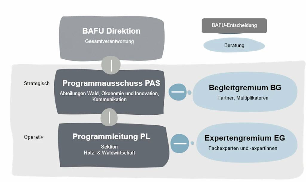 Der Aktionsplan Holz 2021-2026 wird durch vier Gremien gesteuert und umgesetzt. Das BAFU hat die strategische und operative Steuerung des Programms inne. Umgesetzt wird diese durch den Programmausschuss und die Programmleitung. Beide Gremien werden jeweils durch ein externes Gremium beraten und unterstützt. Hierzu zählen das Begleitgremium auf strategischer und das Expertengremium auf operativer Ebene.