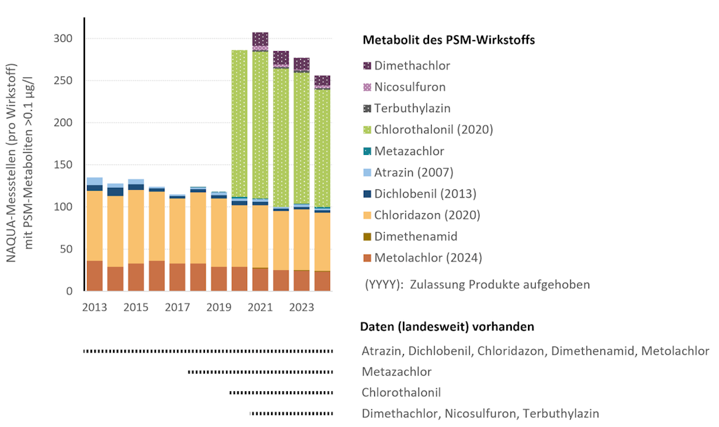 Metaboliten der Herbizide Chloridazon und Metolachlor überschreiten ebenfalls wiederholt und verbreitet den Wert von 0.1 μg/l. Die Metaboliten von Chloridazon traten in den letzten 5 Jahren an bis zu 14% der Messstellen pro Jahr in erhöhten Konzentrationen auf, die Metaboliten von Metolachlor an rund 5% der Messstellen. Die Zulassung von Chloridazon wurde 2020 aufgehoben, die Zulassung von Metolachlor 2024.