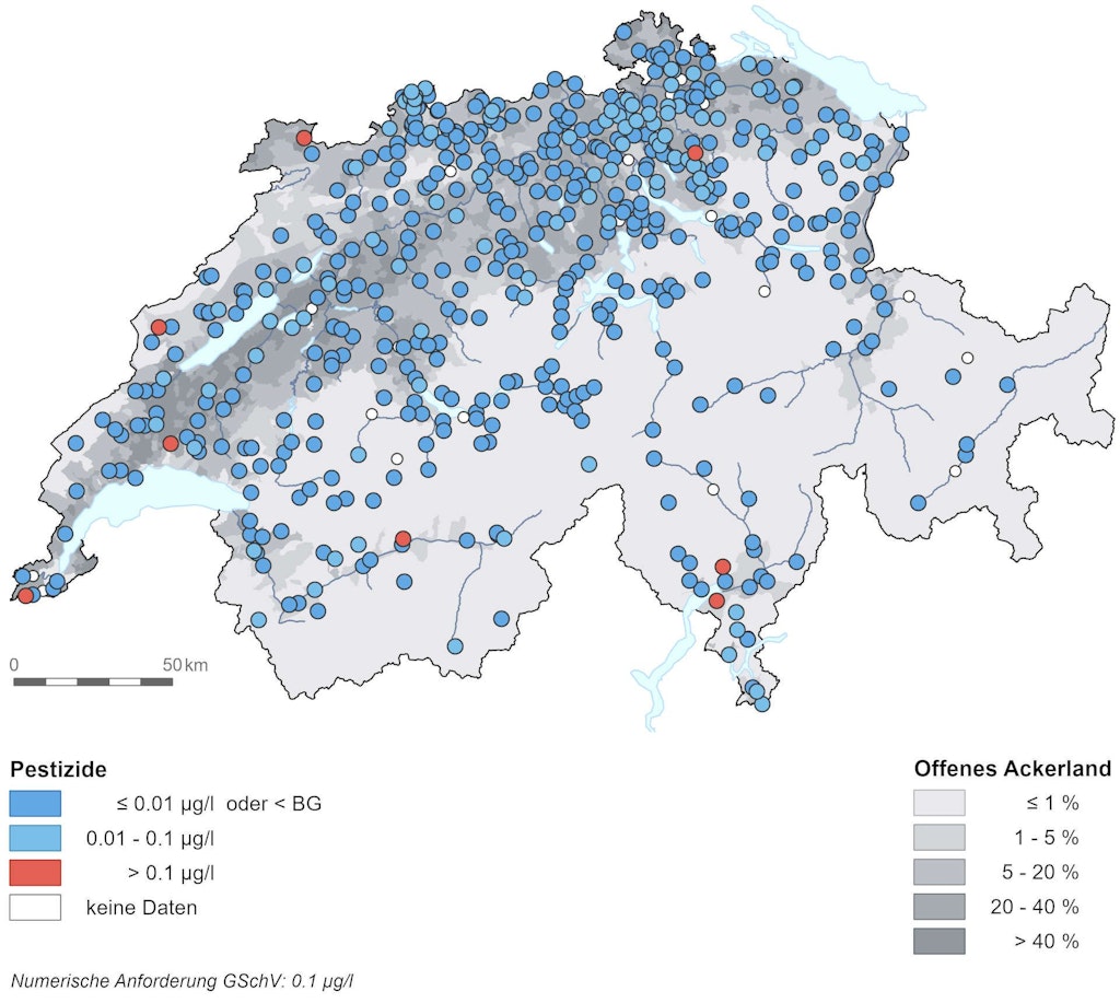 Pestizide überschreiten den Grenzwert pro Jahr jeweils an 1 bis 2% der Messstellen der Nationalen Grundwasserbeobachtung NAQUA. Dieser Prozentsatz ist seit mehr als 10 Jahren weitgehend unverändert. Vor allem Bentazon ist in den letzten Jahren wiederholt in erhöhten Konzentrationen aufgetreten. Grundwasservorkommen in den Karstgebieten des Jura sind besonders empfindlich gegenüber dem Eintrag von Pestiziden. Dort können sie den Grenzwert jeweils kurzfristig, aber z.T sehr deutlich überschreiten.