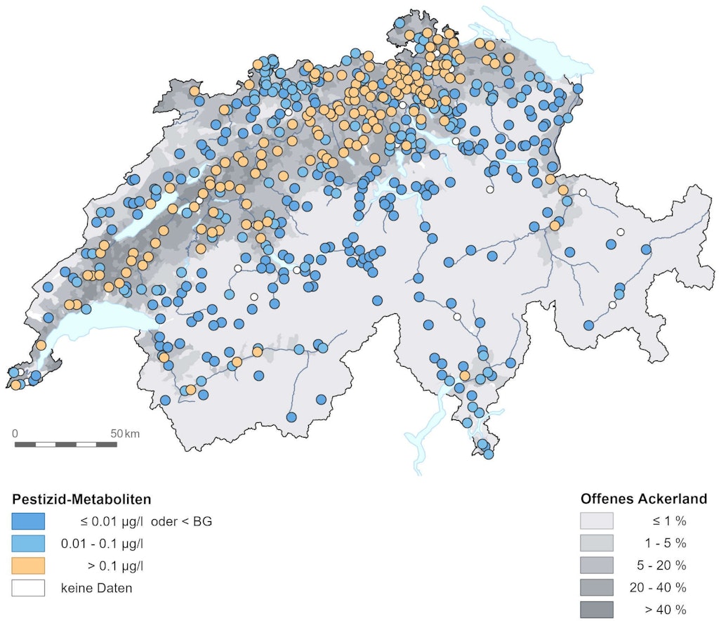 In landwirtschaftlich intensiv genutzten Gebieten sind Metaboliten, d.h. Abbauprodukte von Pestiziden, weit verbreitet. Sie werden regelmässig in Konzentrationen von mehr als 0.1 μg/l nachgewiesen. Im Mittelland überschreiten sie an rund 60% der Messstellen den Wert von 0.1 μg/l. Landesweit ist jede dritte NAQUA-Messstelle betroffen.
