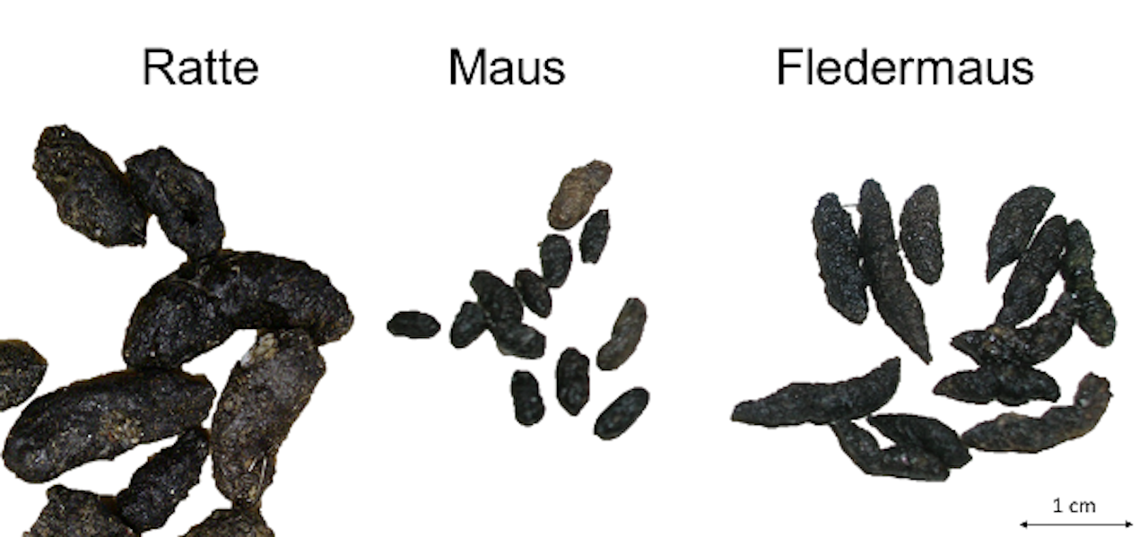 Kot kann ein Zeichen für einen Mäuse- oder Rattenbefall sein. Er kann aber auch von anderen Tieren wie Fledermäusen oder Mardern stammen. Kot von Wanderratte (links), Hausmaus (mitte) und Fledermaus (rechts). — © Stadt Zürich, UGZ, Schädlingsprävention