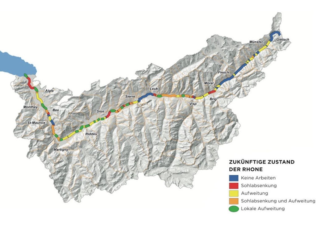 Nach Abschluss der dringenden Arbeiten in rund 20 Jahren werden rund 60 Prozent der möglichen Schäden an der Rhone reduziert sein. Die verbleibenden 40 Prozent werden mit weniger dringenden Massnahmen ab ungefähr dem Jahr 2040 eliminiert, z. B. im Goms, in Gampel, Brig und Evionnaz.