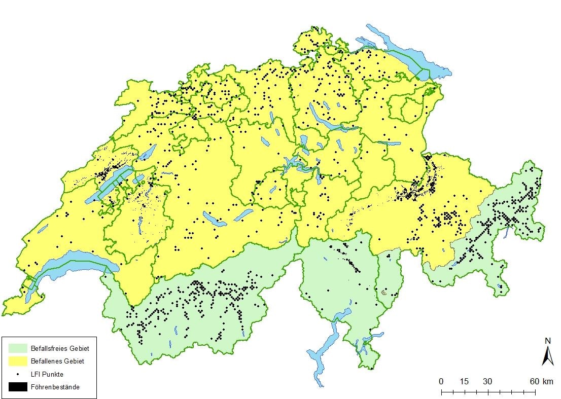 Die Karte zeigt das befallene Gebiet, in dem die Rotband- und Braunfleckenkrankheit diffus auftreten (gelb) und das befallsfreie Gebiet (hellgrün) bestehend aus den Kantonen Tessin, Wallis und der Alpensüdseite, sowie dem Engadin in Graubünden. Neu auftretende, kleine Befallsherde werden hier von den kantonalen Forstdiensten sachgerecht entfernt und vernichtet.