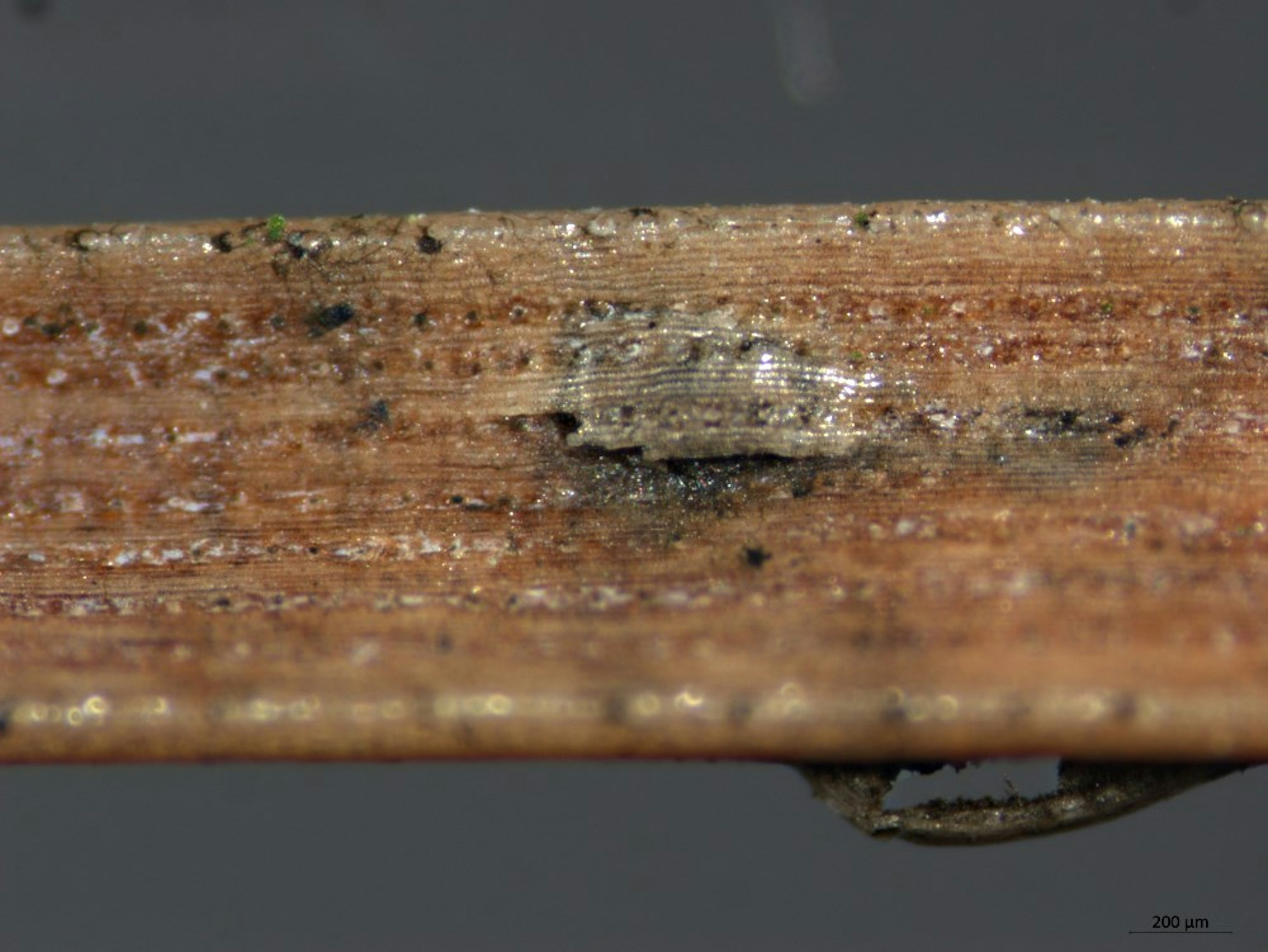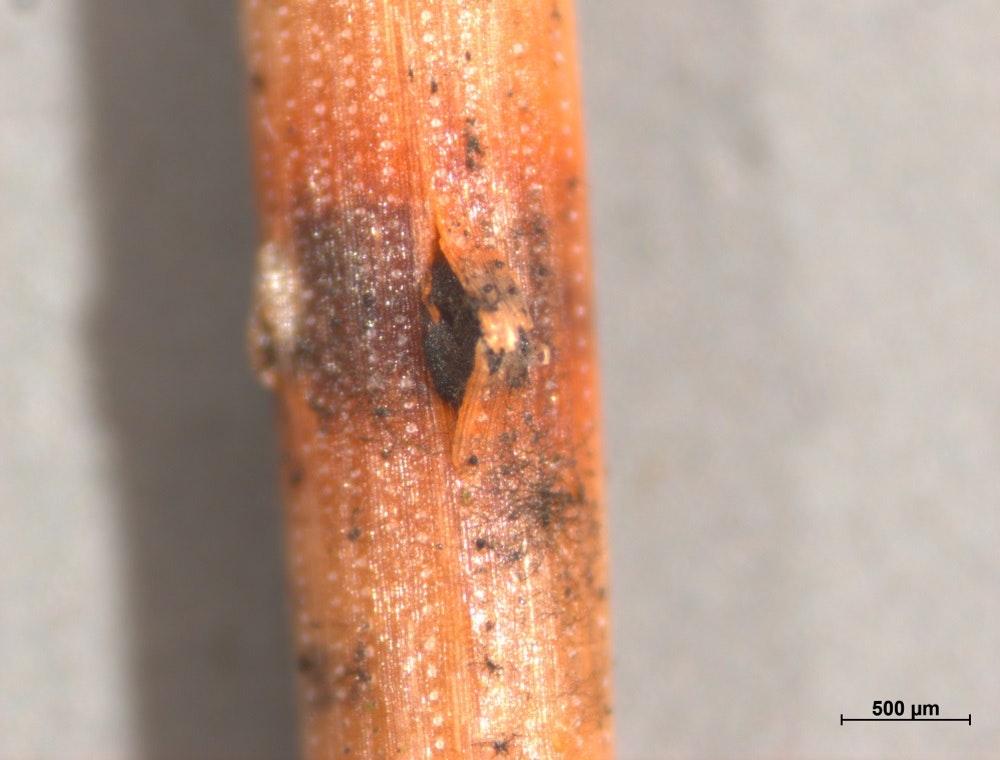 - Schwarze Pilzfruchtkörper (0.2-0.8 mm) in der Mitte der Bänder oder der Flecken