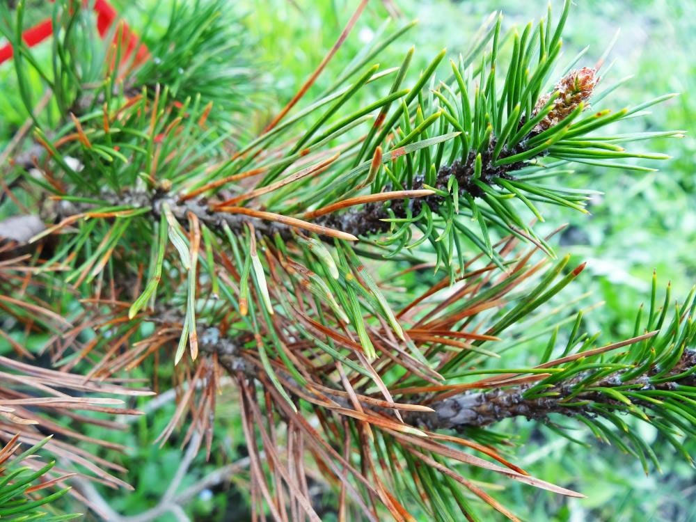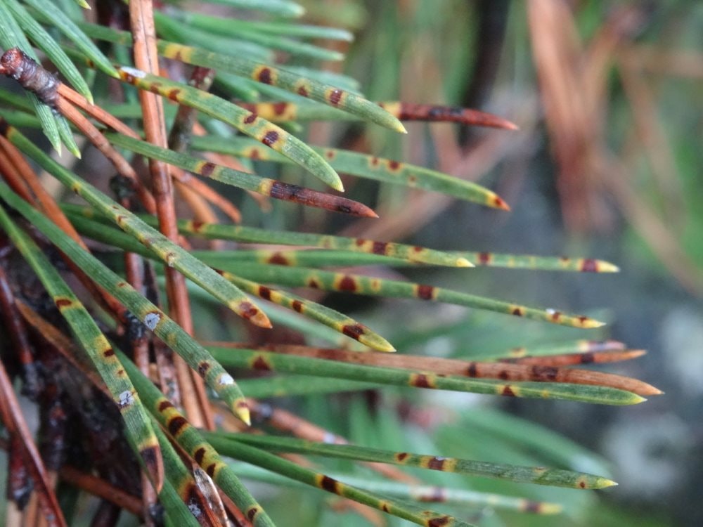 - Bei der Rotbandkrankheit: häufig 1-2 mm rote Bänder auf befallenen braunen Nadeln