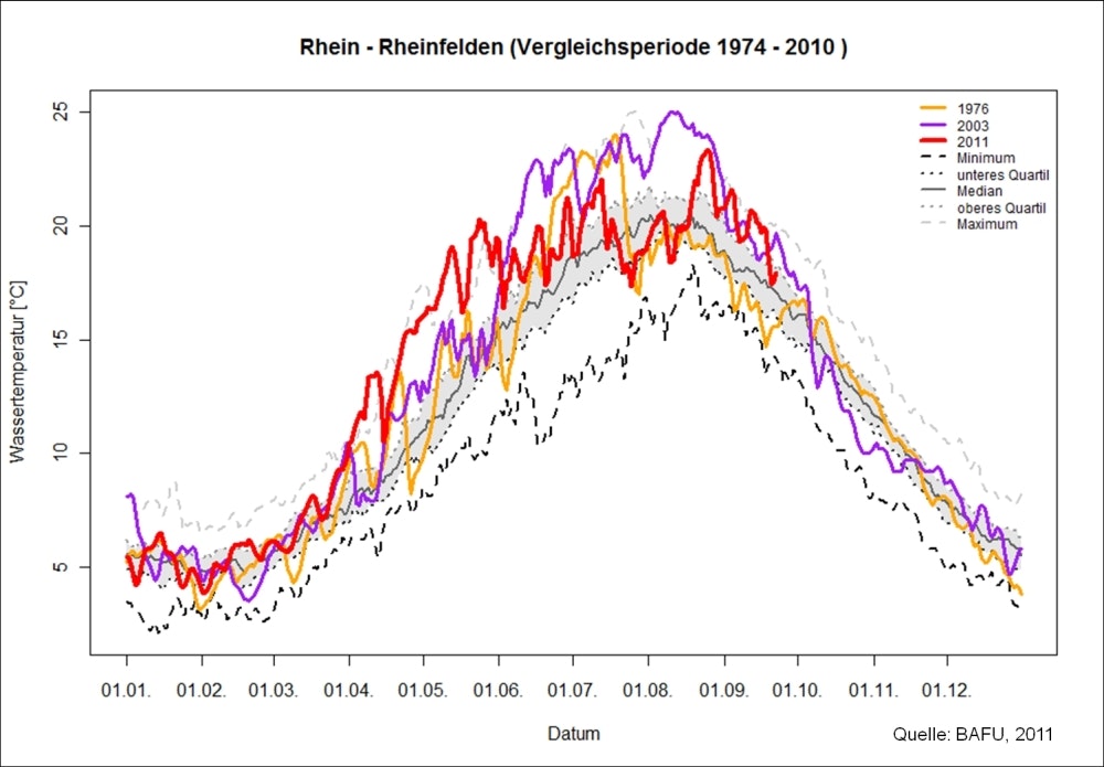 Wassertemperaturen mit saisonalen HöchstwertenDie Kombination von hoher Sonneneinstrahlung und niedrigen Wasserständen führte zu aussergewöhnlich hohen Wassertemperaturen vor allem im April und Mai 2011. Die saisonalen Höchstwerte traten im Mittelland in den kleineren und mittleren Gewässern wie Thur, Birs, Saane, Broye und Emme grösstenteils im Verlauf des Aprils auf.