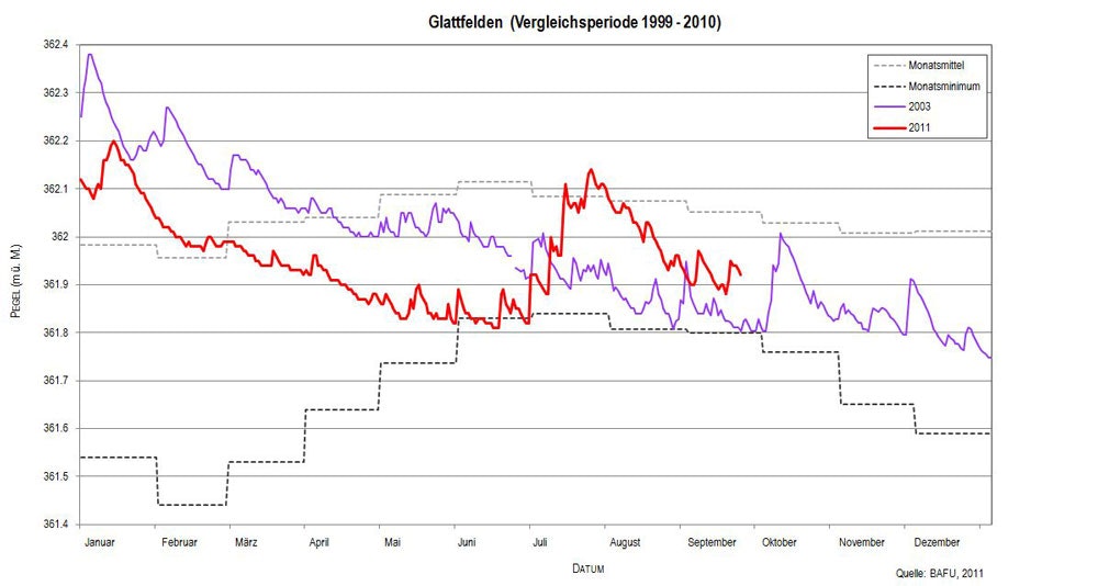 Die Grundwasserstände und Quellschüttungen waren im Mai und Juni 2011 im Vergleich zu 2003 bedeutend tiefer, da sie im Gegensatz zu 2003 nicht von einem hohen Ausgangsniveau im vorausgegangenen Winter profitieren konnten.