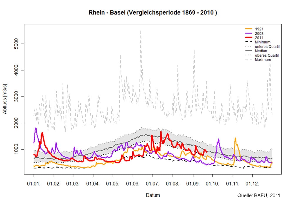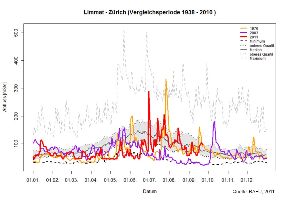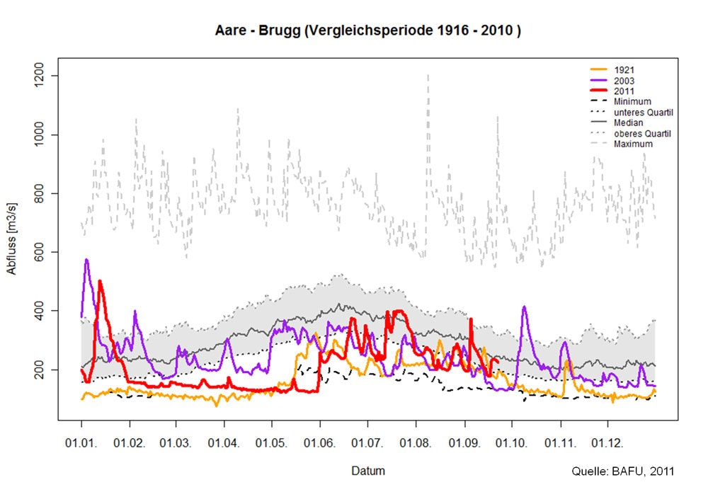 Hydrologischer Spezialbericht des Bundesamtes für Umwelt BAFU Der Frühling 2011 bleibt als extrem warm und trocken in Erinnerung. Aus hydrologischer Sicht gehen vor allem die für diese Jahreszeit aussergewöhnlich tiefen Wasserstände der Flüsse, der Seen und des Grundwassers in die Geschichte ein. Besonders ausgeprägt war die Situation im Jura und im Mittelland. Damit verbunden waren hohe Wassertemperaturen, die an mehreren Flüssen die bisherigen saisonalen Höchstwerte überstiegen. Die überdurchschnittlichen Regenmengen im Juli führten schliesslich dazu, dass sich die Situation weitgehend normalisierte.