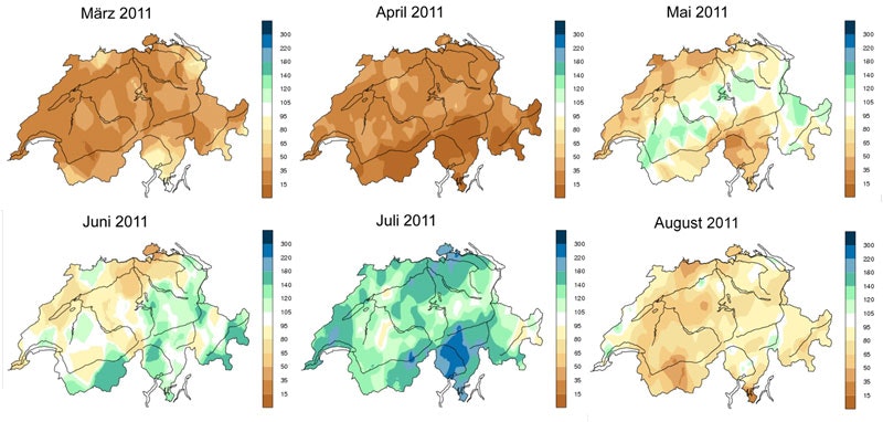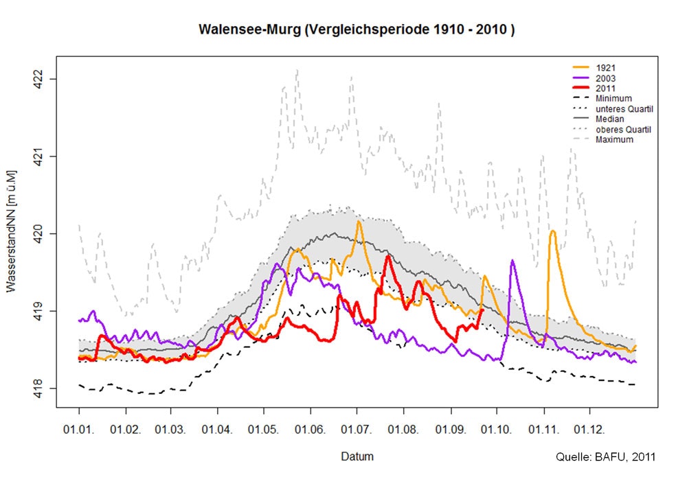 Beispielsweise wurden zwischen dem 25. März und dem 20. Mai 2011 beim Murten- und Neuenburgersee neue Tiefststände seit 1983 verzeichnet. Im Zeitraum vom 13. Mai bis 18. Juni war derWalenseeseit Messbeginn 1910 noch nie so tief wie in diesem Jahr. Während mehreren Tagen im Juni erreichten auch die Wasserstände des Zürichsees, des Bodensees und des Lago Maggiore für die Jahreszeit historische Tiefstwerte.