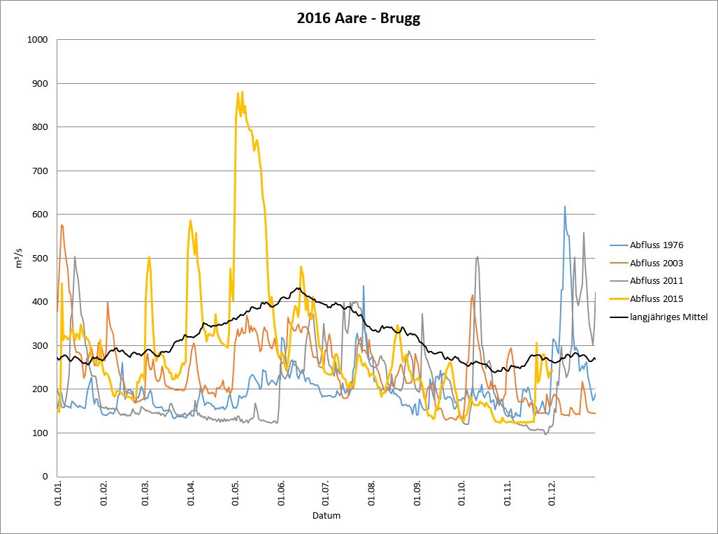 04.12.2015. Hydrologischer Spezialbericht des Bundesamtes für Umwelt BAFU Die Sommermonate Juli und August 2015 bleiben als aussergewöhnlich trocken und heiss in Erinnerung. Auch im Herbst fielen insbesondere auf der Alpennordseite für die Jahreszeit deutlich unterdurchschnittliche Niederschlagsmengen. So verzeichneten viele Gegenden der Schweiz in der Zeit vom 29. Oktober bis zum 20. November überhaupt keine Niederschläge. Aus hydrologischer Sicht sind vor allem die für die Jahreszeit aussergewöhnlich tiefen Wasserstände der Flüsse, der Seen und des Grundwassers bemerkenswert. Besonders ausgeprägt zeigte sich die Situation Mitte November im Mittelland und im Jura. Hier sind die Wasserstände und Abflüsse an einigen Orten bereits seit Ende Juni unterdurchschnittlich.