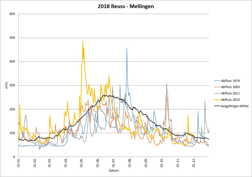 Beschränkte sich die Niedrigwassersituation zu Beginn auf die schneller reagierenden kleineren und mittleren Fliessgewässer, so waren ab Mitte Juli zunehmend auch grosse Flüsse wie die Aare, die Limmat, die Reuss, die Thur und der Rhein betroffen. An zahlreichen Messstationen wurden Abflüsse beobachtet, wie sie statistisch gesehen nur einmal alle 2-10 Jahre vorkommen. In einigen Regionen wurden von den lokalen Behörden Einschränkungen und Verbote bezüglich Wasserentnahmen aus Fliessgewässern ausgesprochen.
