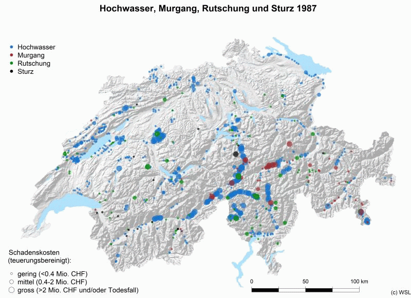 Insgesamt betragen die Kosten für Schäden in der Schweiz infolge von Hochwasser, Murgängen, Rutschungen und Sturzprozessen seit dem Jahr 1972 rund 300 Millionen Franken. Der Grossteil dieses Betrags ist auf Hochwasser zurückzuführen. Das Ausmass eines Schadens hängt von mehreren Faktoren ab: