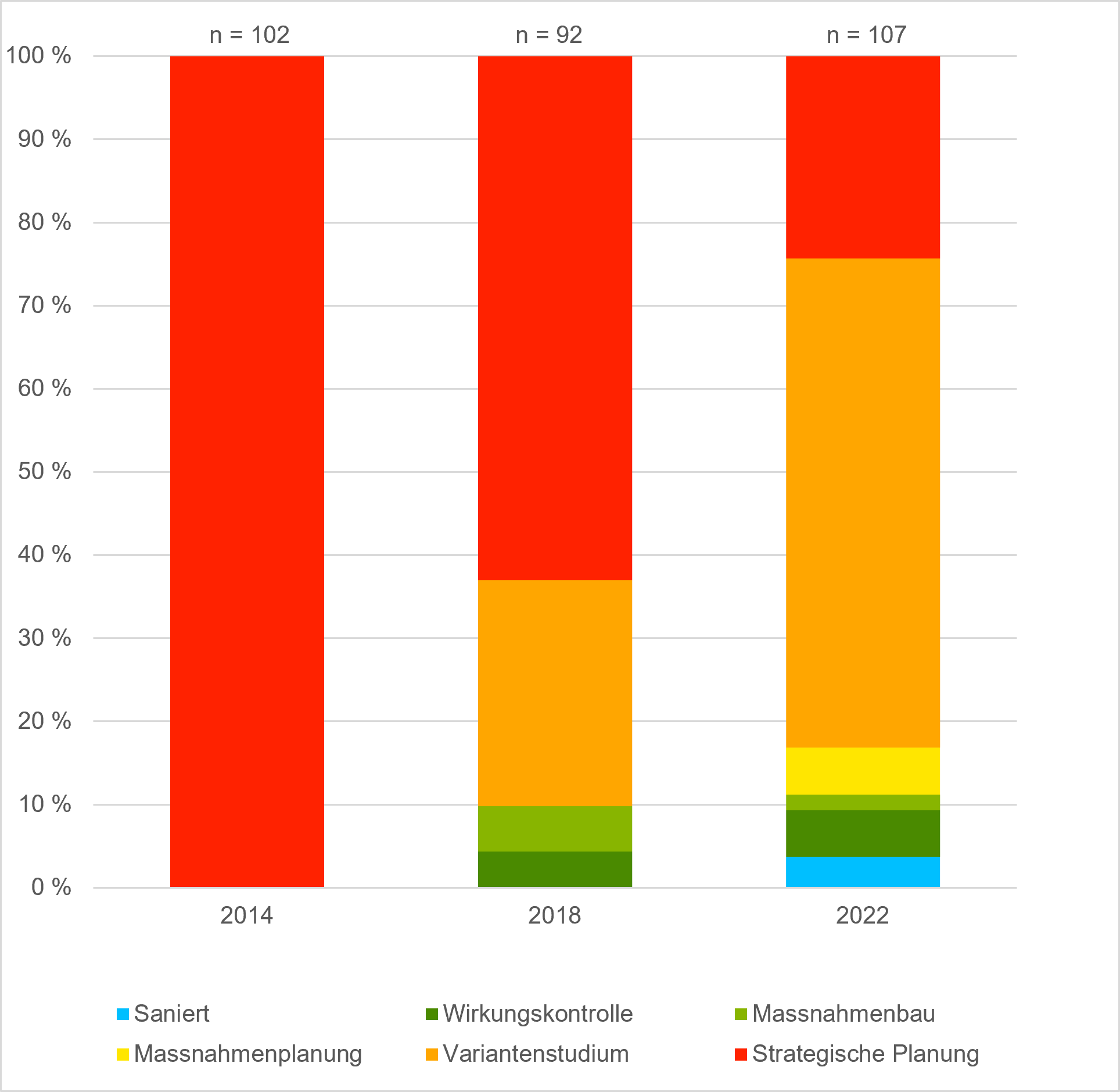 Die Anzahl Massnahmen, die pro Jahr in die Umsetzung kamen, hat im Vergleich zur Umsetzungsperiode 2014 – 2018 abgenommen. Jedoch waren bis Ende 2022 bei einem Grossteil der sanierungsbedürftigen Anlagen bereits die Planungsarbeiten am Laufen. Bei rund drei Viertel aller gemeldeten sanierungsbedürftigen Anlagen wurde mit den Sanierungsarbeiten begonnen.
