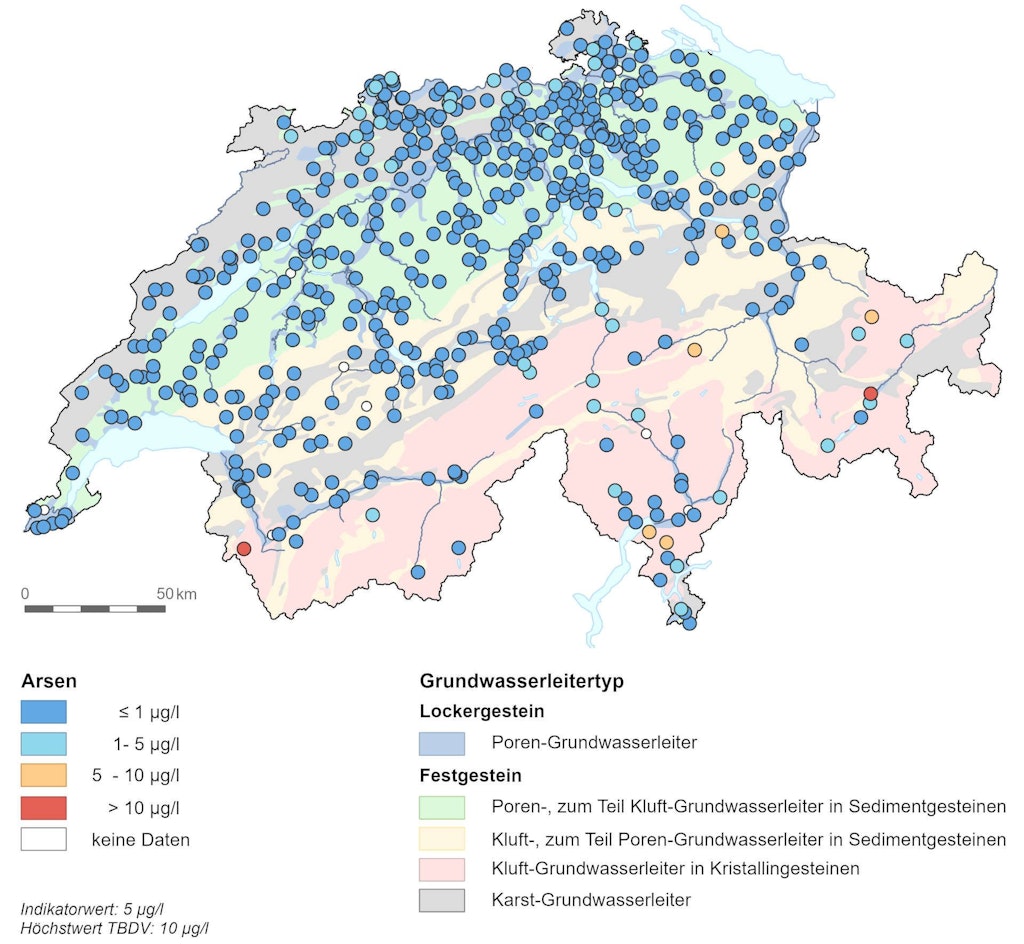 Die Konzentrationen von Arsen sind insgesamt gering und liegen im Mittelland und in den Voralpen grösstenteils unter 1 µg/l. Lokal erhöhte Konzentrationen über 5 µg/l treten fast ausschliesslich in kristallinen Kluft-Grundwasserleitern in den Alpen und auf der Alpensüdseite auf. Diese sind auf natürliche Erzlagerstätten und Kristallingesteine mit erhöhtem Arsengehalt zurückzuführen.
