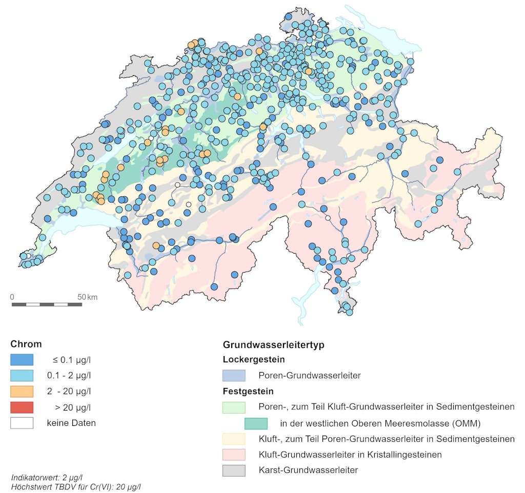 Konzentrationen über dem Indikatorwert von 2 µg/l werden vor allem im westlichen Mittelland zwischen Lausanne und Bern gemessen. Diese sind auf natürliche Chrom-Vorkommen in den Molassegesteinen der Westschweiz zurückzuführen. Vereinzelte Überschreitungen der Indikatorwerte im Raum Basel und Zürich haben wahrscheinlich anthropogene Ursachen. Chrom kann z.B. von belasteten Deponiestandorten oder aus undichten Kanalisationen ins Grundwasser gelangen.