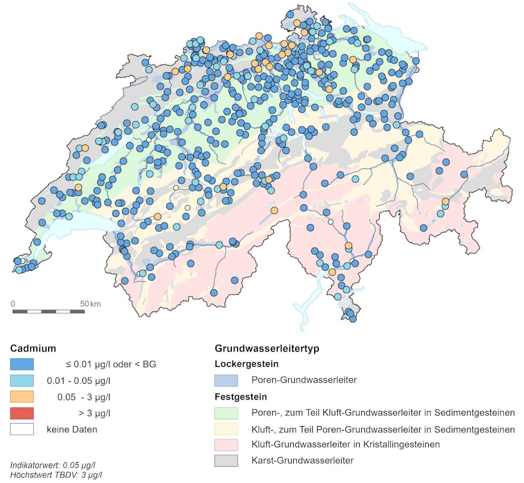 An 80% der untersuchten Messstellen liegen die Cadmium-Konzentrationen unter der Bestimmungsgrenze von 0.01 µg/l. Der Höchstwert der TBDV für Trinkwasser von 3 µg/l wird an keiner Messstelle überschritten. Messstellen mit Konzentrationen über dem Indikatorwert der Wegleitung Grundwasserschutz befinden sich vor allem im östlichen Teil des Jura und des Mittellands. Einzelne erhöhte Konzentrationen treten an Messstellen in den Voralpen, den Alpen und auf der Alpensüdseite auf. Über 35% der Messstellen mit Konzentrationen über dem Indikatorwert der Wegleitung Grundwasserschutz liegen in einem überwiegend ackerbaulich geprägten Einzugsgebiet.