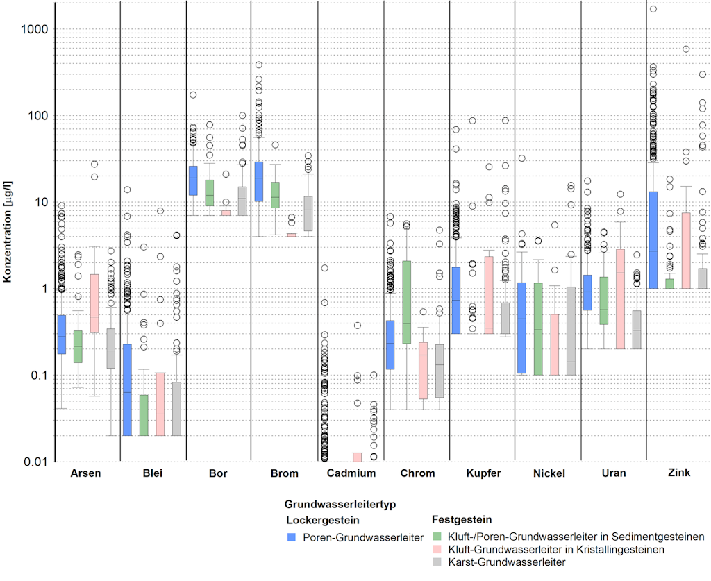 Die Konzentrationen von Spurenelementen im Grundwasser sind meist gering und spiegeln in erster Linie die natürlichen Hintergrundwerte wider. Grundwasservorkommen in Kristallingesteinen weisen die höchsten Konzentrationen an Arsen und Uran auf. Leicht erhöhte Konzentrationen von Blei, Bor, Brom, Cadmium, Kupfer und Zink treten vor allem in Poren-Grundwasserleitern im Lockergestein unter Siedlungs- und landwirtschaftlich geprägten Gebieten auf.