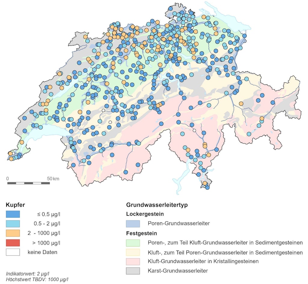 Landesweit sind die Kupfer-Konzentrationen im Jura und im Mittelland höher als in den Voralpen und den Alpen, wo sie mit wenigen Ausnahmen geringer als 2 µg/l sind. Der Höchstwert der TBDV für Trinkwasser von 1000 µg/l wird an keiner Messstelle überschritten.