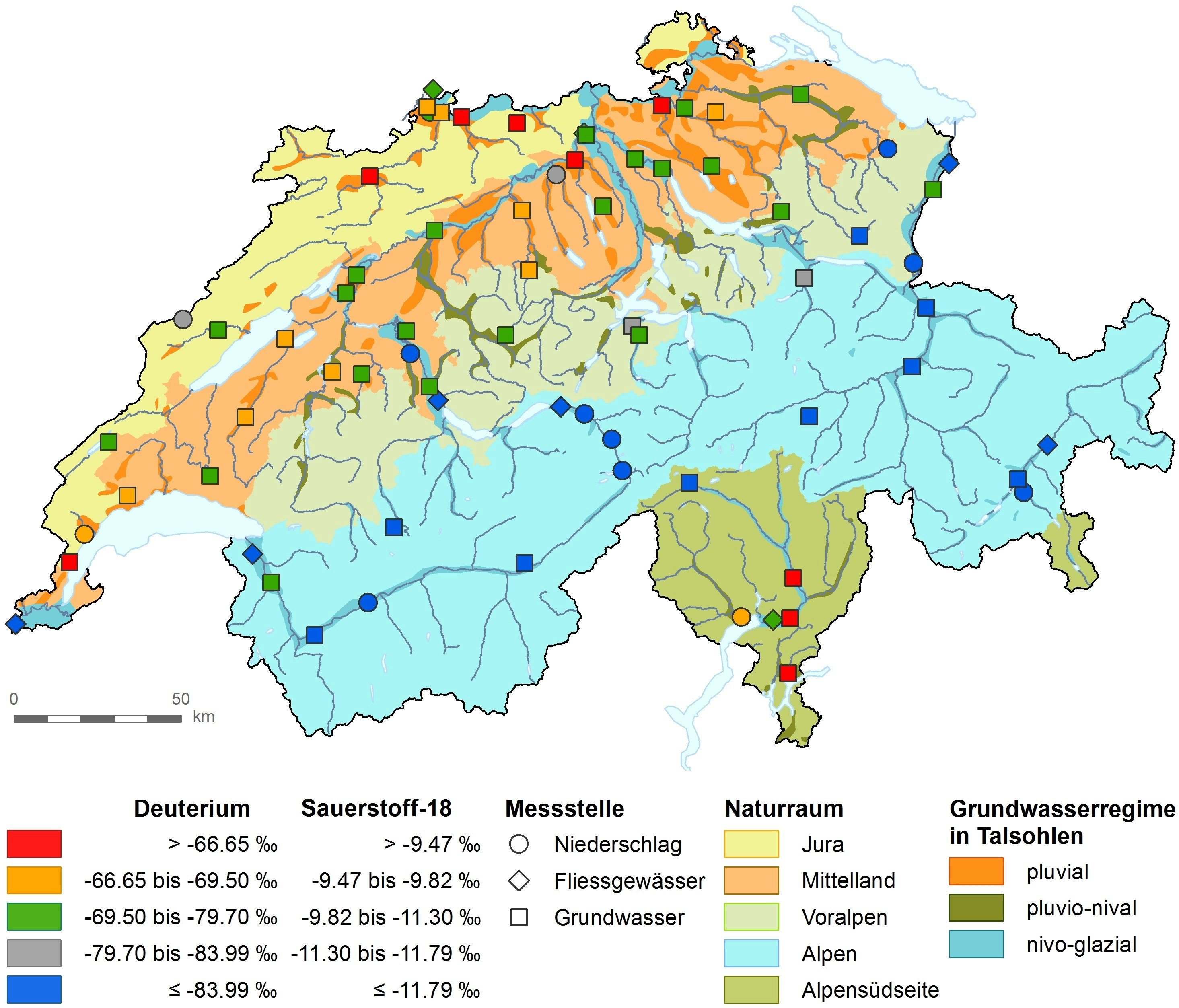 Im Rahmen der Nationalen Grundwasserbeobachtung NAQUA, Modul ISOT, werden seit 1980 Isotopen-Referenzdaten im Niederschlag (13 Messstellen) und an Fliessgewässern (9 Messstellen) für angewandt-hydrologische Studien erhoben. Im Rahmen einer Pilotstudie wurden von 2006 bis 2013 die 50 Grundwasser-Messstellen des NAQUA-Moduls TREND auf Deuterium und Sauerstoff-18 analysiert, um die Dynamik der Grundwasserneubildung und die Oberflächenwasser-/Grundwasser-Wechselwirkung zu charakterisieren.