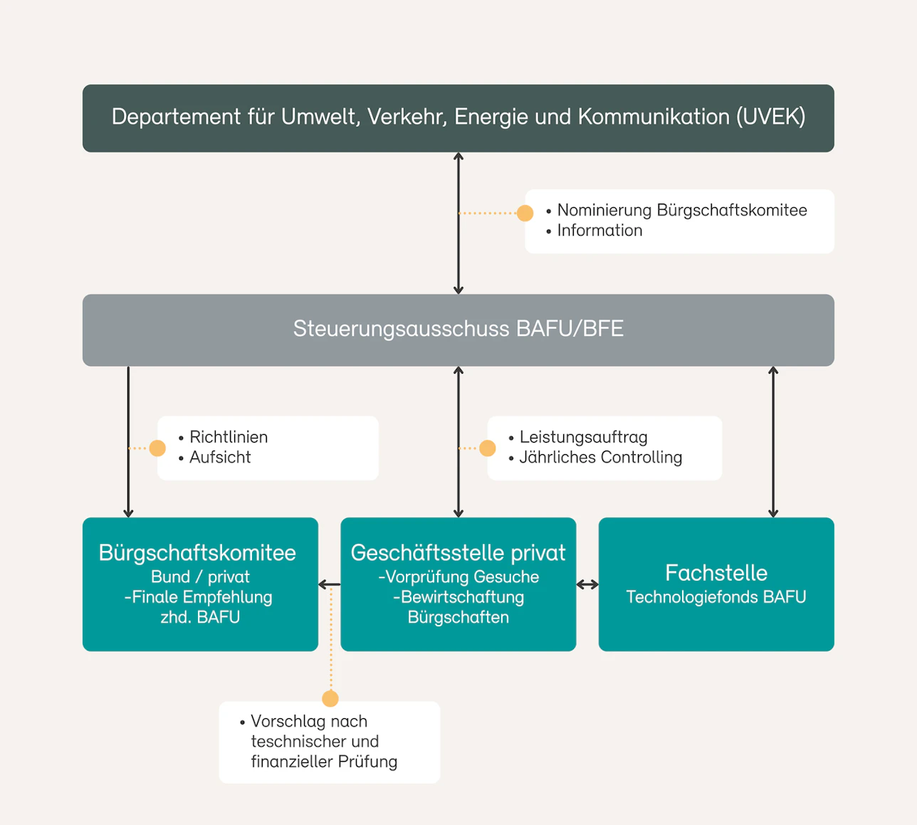 Die Geschäftsstelle prüft die Gesuche sowohl hinsichtlich ihrer technologischen Eignung als auch der finanziellen Struktur und Tragfähigkeit des Unternehmens. Auf dieser Grundlage beurteilt ein Bürgschaftskomitee aus Vertretern des Bundes und der Privatwirtschaft die Gesuche zuhanden des BAFU. Die operative Aufsicht liegt beim Steuerungsausschuss, der aus je einem Geschäftsleitungsmitglied der Bundesämter für Umwelt (BAFU) und für Energie (BFE) besteht. Als Ansprechpartnerin und zur Unterstützung der Gremien führt das BAFU eine Fachstelle Technologiefonds. Die Mitglieder des Bürgschaftskomitees werden vom UVEK nominiert.