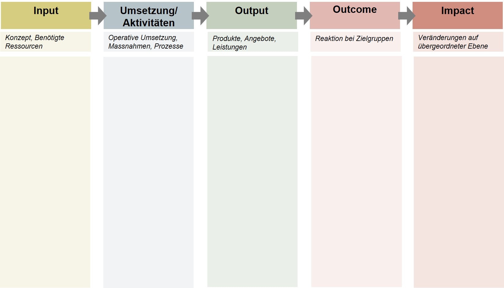 - Modul 2 «Wirkungszusammenhänge darstellen»: Dieses Modul dient dazu, die verschiedenen Komponenten eines Wirkungsmodells detailliert auszuarbeiten. Es geht um die Darstellung der Beziehungen zwischen Massnahmen, Aktivitäten und deren erwarteten Wirkungen.