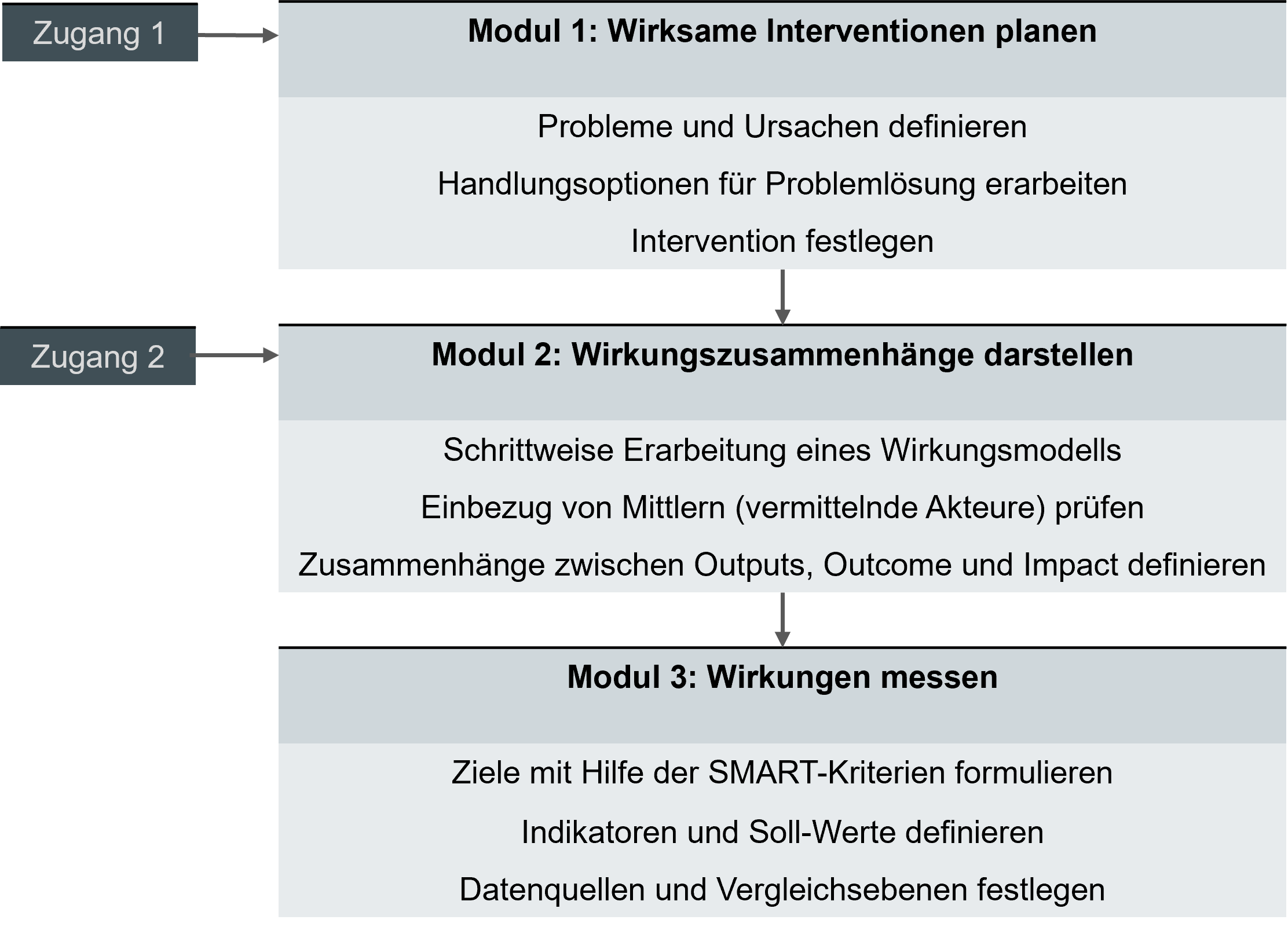 Je nach Fragestellung und Bedarf können Anwender/-innen zwei Zugänge auswählen, entweder mit Modul 1 oder Modul 2 starten. Modul 1 eignet sich besonders für die initiale Planung von Interventionen, während Modul 2 darauf ausgelegt ist, die spezifischen Elemente eines Wirkungsmodells zu erarbeiten. Voraussetzung für Modul 3, welches für eine SMART-Zielformulierung sowie für die Definition von Indikatoren dient, ist der Zugang über Modul 2.