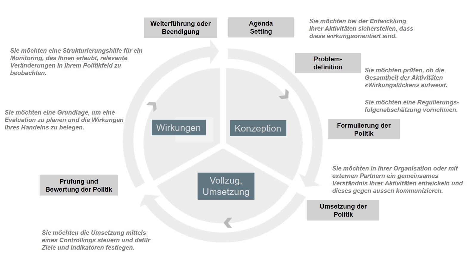 Wirkungsmodelle sind auch als Arbeitsinstrument zu verstehen. Nicht selten werden die entwickelten Wirkungsmodelle im Verlauf ihrer Entstehung und Nutzung im Politikzyklus angepasst und weiterentwickelt. Sie dienen dazu, den Kreislauf zwischen politischer Strategieentwicklung, Wirkungsmessung und Strategieänderung oder -optimierung zu unterstützen.