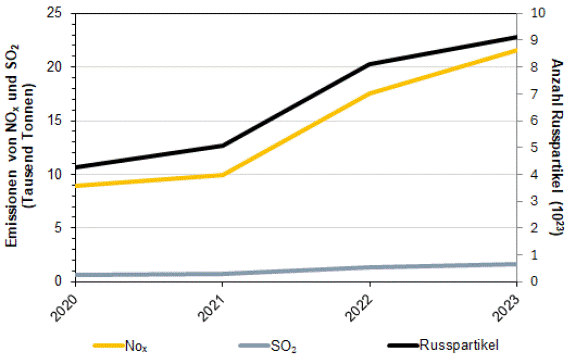 Die Klimawirkung des Flugverkehrs wird nach aktuellem Wissen langfristig durch dessen CO2-Emissionen dominiert. Emissionen des Flugverkehrs enthalten neben den Treibhausgasen aber zusätzliche Schadstoffe, die das Klima wärmend oder auch kühlend beeinflussen. Relevant sind insbesondere Stickoxide (NOx), Schwefeldioxid (SO2) und ultrafeine Russpartikel. Die zeitliche Entwicklung dieser Nicht-CO2-Emissionen ist in der nachfolgenden Grafik dargestellt.