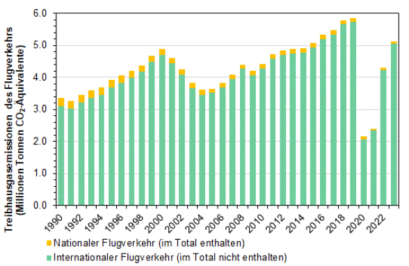 Das Treibhausgasinventar weist die Emissionen aus dem nationalen und internationalen Flugverkehr separat aus. Die Emissionen aus den internationalen Flügen dominieren, das nationale Total berücksichtigt jedoch nur die Emissionen aus den nationalen Flügen. Nicht-CO2-Emissionen erhöhen die Klimawirkung des Flugverkehrs.