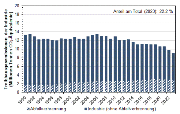 Unter dem Sektor Industrie werden die energie- und prozessbedingten Emissionen aus industriellen Aktivitäten ausgewiesen. Ebenso enthalten sind die Emissionen aus der Verbrennung von Abfällen in Kehricht- und Sondermüllverbrennungsanlagen sowie als alternativer Brennstoff in industriellen Feuerungen.