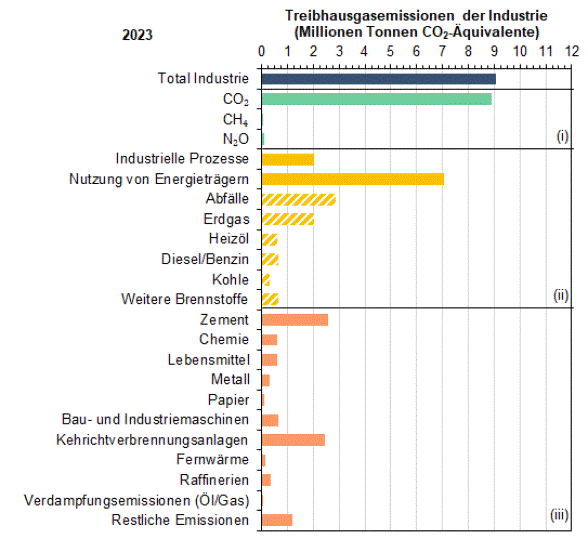 Die Treibhausgasemissionen des Sektors Industrie bestehen mehrheitlich aus Kohlendioxid (CO2), welche bei der energetischen Nutzung fossiler Energieträger, der Verbrennung von Abfällen (Kehricht- und Sondermüllverbrennungsanlagen, alternativer Brennstoff in industriellen Feuerungen) sowie prozessbedingt bei der Herstellung von Zement entstehen. Im Sektor Industrie ebenso enthalten sind die Emissionen aus Bau- und Industriemaschinen. Die Emissionen von Methan (CH4) und Lachgas (N2O) aus dem Sektor Industrie sind im Vergleich zu den CO2-Emissionen relativ gering. Die CH4-Emissionen stammen vorwiegend aus Gasverlusten, welche beim Transport und der energetischen Nutzung von Erdgas entstehen. Die N2O-Emissionen stammen vorwiegend aus der chemischen Industrie.