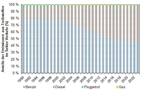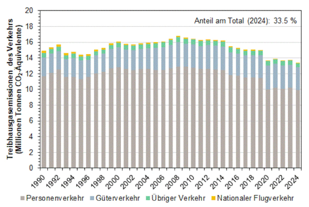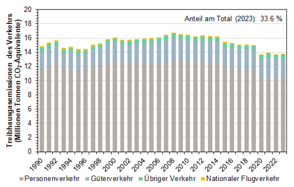 Die grössten Anteile der Emissionen im Sektor Verkehr stammen vom Personenverkehr (Personenwagen, Motorräder, Reisebusse), gefolgt vom Güterverkehr (Lastwagen und Lieferwagen). Der übrige Verkehr (Bahn, Schifffahrt, Linienbusse, Pipelinetransport, Militär inklusive militärische Flüge, Tanktourismus und statistische Differenz) sowie der nationale Flugverkehr (zivile Inlandsflüge) tragen in geringerem Ausmass zu den Emissionen aus dem Sektor Verkehr bei. Die Emissionen aus dem internationalen Flug- und Schiffsverkehr sind übereinstimmend mit den Richtlinien der UNO-Klimakonvention im nationalen Emissionstotal und damit auch im hier gezeigten Sektor Verkehr nicht enthalten. Die Emissionen aus Bau- und Industriemaschinen werden dem Sektor Industrie zugeordnet. Die Emissionen aus land- und forstwirtschaftlichen Fahrzeugen und Maschinen werden dem Sektor Landwirtschaft zugeordnet.