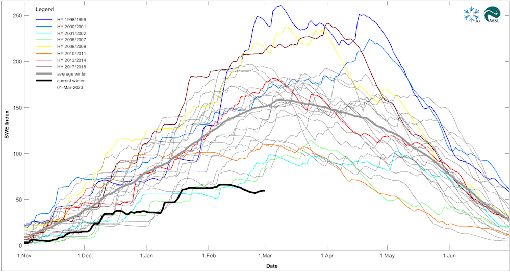 Ob der aktuelle Schnee- und Regenmangel aber im Frühling oder Sommer 2023 zu einer grösseren Niedrigwassersituation in den Gewässern führt, kann noch nicht vorhergesagt werden. Dies hängt stark von den Niederschlägen in den kommenden Wochen und Monaten ab. Alleine um das Schneedefizit auszugleichen, bräuchte es statistisch gesehen schweizweit über 100 mm Niederschlag. In den Bergregionen sind die Defizite am grössten. Hier fehlen lokal mehr als 200 mm Wasser, welches sonst in dieser Jahreszeit im Schnee gebunden ist. Grössere und längere Regenfälle im Frühling könnten die Situation aber immer noch normalisieren oder zumindest entschärfen.