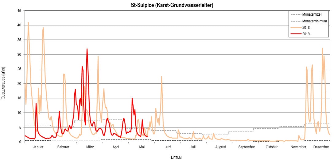 Als Folge der Niederschläge in der zweiten Maihälfte stiegen auch die Grundwasserstände und Quellabflüsse von oberflächennahen sowie von flussgebundenen Grundwasserleitern kurzzeitig an. In der Regel reagieren Grundwasserstände jedoch verzögert und gedämpft auf Witterungsereignisse, und so waren im Mai für die Jahreszeit nach wie vor normale bis tiefe Grundwasserstände zu verzeichnen.