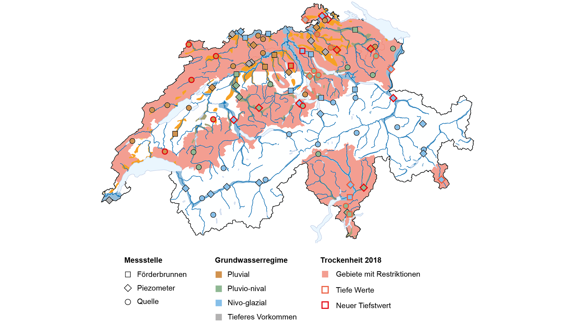 Der Klimawandel wird voraussichtlich zu längeren und häufigeren Trockenheiten führen, was ein landesweites Monitoring der Auswirkungen auf das Grundwasser unabdingbar macht. Im Rahmen der Nationalen Grundwasserbeobachtung NAQUA werden die Grundwasserquantität und -temperatur an rund 100 Messstellen beobachtet.