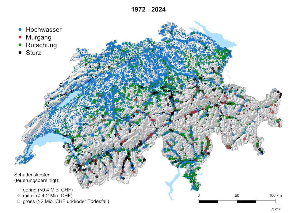 Zwischen 1972 und 2024 verursachten Hochwasser, Murgänge, Rutschungen und Sturzprozesse in der Schweiz durchschnittliche Schäden von rund CHF 321 Mio. pro Jahr. Über 90 % der Schäden sind auf Hochwasser und Murgänge zurückzuführen.