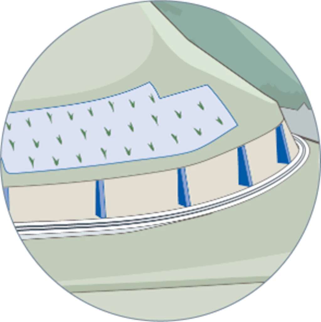 Entlang steiler Hänge und Felswände dienen Steinschlagschutznetze und -Dämme sowie die Felssicherung dem Schutz von Strassen, Gebäuden und anderen gefährdeten Bereichen.