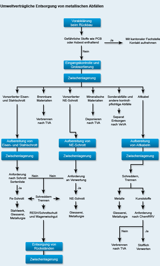 Durch Separatsammlung oder durch Sortierung werden Eisen- und Nichteisenschrott getrennt. Grössere Teile werden durch Scheren (Grobzerkleinerung auf chargier fähige Masse) oder Schreddern (Feinzerkleinerung mit Trennprozessen) zerkleinert. Dabei werden auch nichtmetallische Materialien aus Anhaftungen oder Verbundmaterialien abgetrennt. Diese Rückstände sind oft stark mit Schadstoffen belastet und müssen separat entsorgt werden. Kabel stammen aus dem Rückbau von Gebäuden und Anlagen oder aus der Demontage von Geräten und werden in Leiter und Ummantelung zerlegt.
