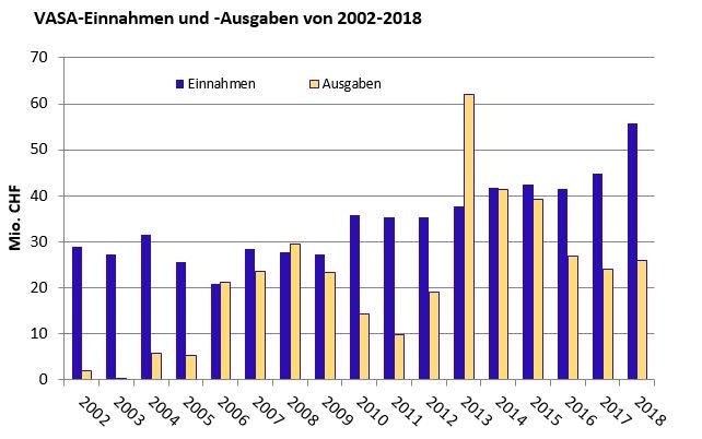 Im Vergleich zum Jahr 2017 (44.8 Mio. Franken) sind die Einnahmen im Jahr 2018 um 24.3 % (10.9 Mio. Franken) auf 55.7 Mio. Franken gestiegen. Dieser Anstieg ist auf die neuen VASA-Abgabesätze, die für das Bemessungsjahr 2017 erstmals angewendet wurden, zurückzuführen.