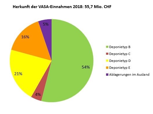 Die Einnahmen im Jahr 2018 betrugen 55.7 Mio. Franken. Diese betreffen das VASA-Bemessungsjahr 2017. Der Hauptteil der Einnahmen steuerten mit 30 Mio. Franken die Deponien des Typs B bei. Aus den Deponien des Typs C flossen 2.43 Mio. Franken, des Typs D 11.7 Mio. Franken und des Typs E 8.6 Mio. Franken in den VASA-Fonds ein. Die VASA-Einnahmen aus den Ablagerungen im Ausland betragen 2.8 Mio. Franken (prozentuale Aufteilung siehe Abb. 1).
