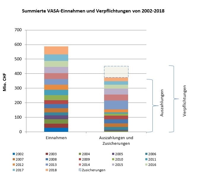 Die von 2002 bis 2018 summierten VASA-Auszahlungen im Gesamtwert von 374 Mio. Franken und Zusicherungen von 77 Mio. Franken stehen VASA-Einnahmen von 588 Mio. Franken gegenüber. Die Summe der Auszahlungen und der Zusicherungen ergibt die total verpflichtete Summe von 451 Mio. Franken. Die Differenz der summierten VASA-Einnahmen und der verpflichteten Summe ergibt also den (virtuellen) Kontostand per 31.12.2018 in der Höhe von 137 Mio. Franken (siehe Abb. 3).