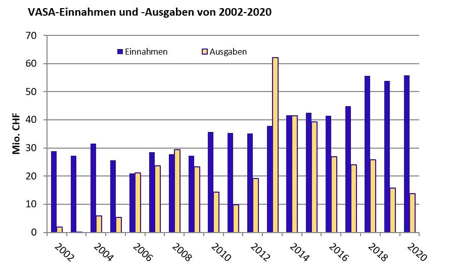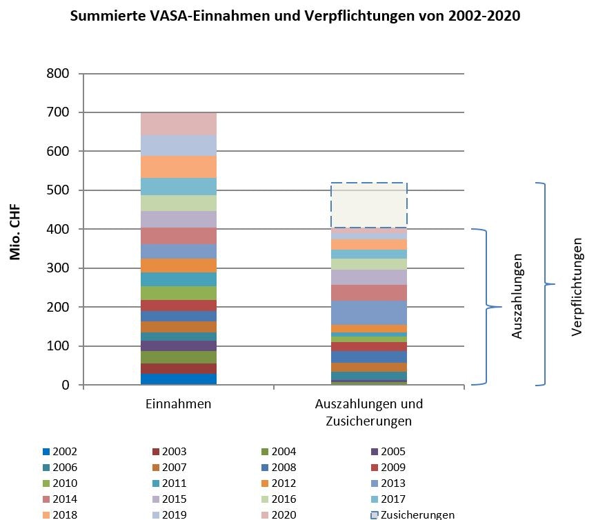 Die von 2002 bis 2020 summierten VASA-Auszahlungen im Gesamtwert von 403 Mio. CHF und Zusicherungen von 116 Mio. CHF stehen VASA-Einnahmen von 698 Mio. CHF gegenüber. Die Summe der Auszahlungen und der Zusicherungen ergibt die total verpflichtete Summe von rund 520 Mio. CHF. Die Differenz der summierten VASA-Einnahmen und der verpflichteten Summe ergibt also den (virtuellen) Kontostand per 31.12.2020 in der Höhe von 178 Mio. CHF (siehe Abb. 3).